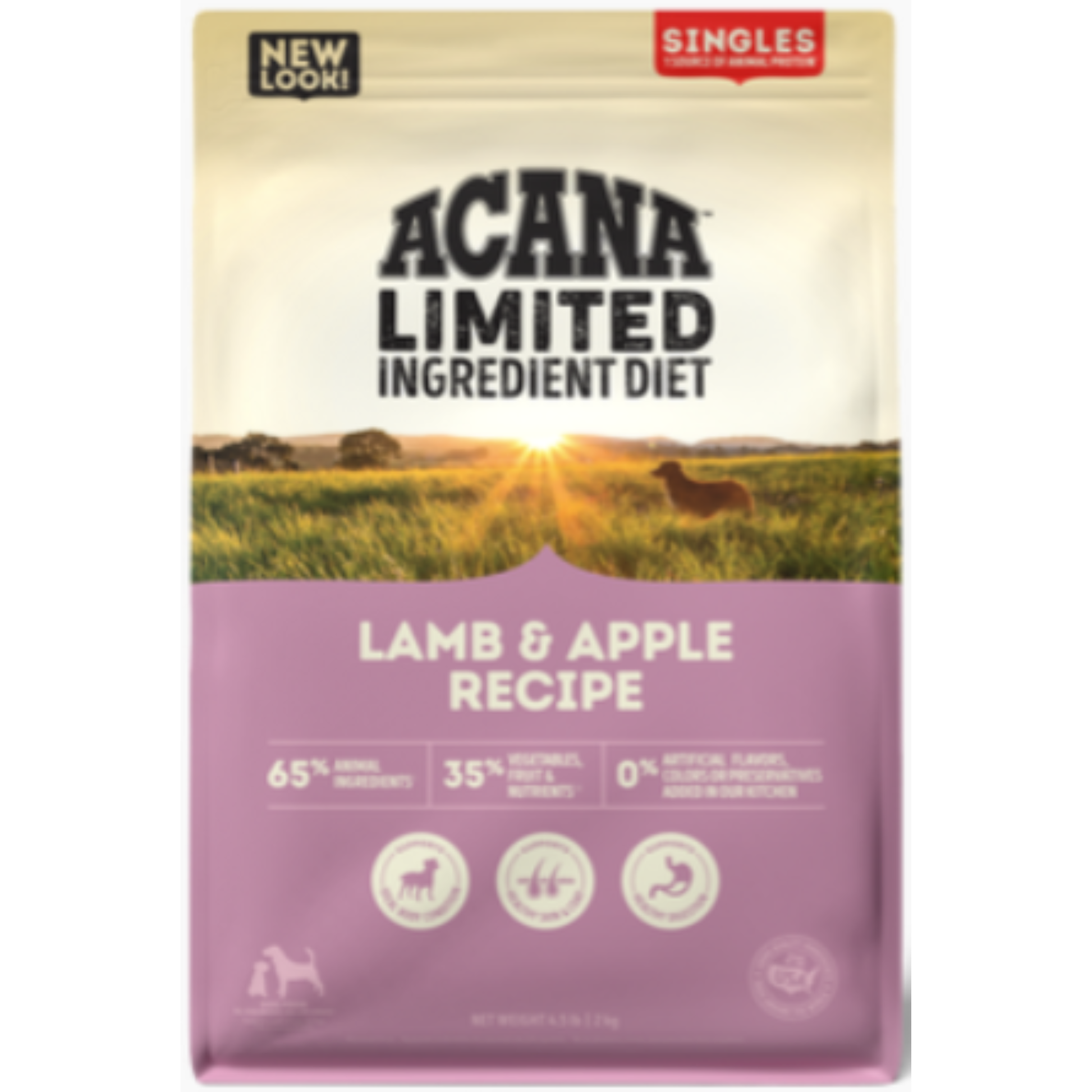 מתכון ACANA Lamb & Apple מסדרת Singles, עם 65% רכיבים מהחי (כולל כבש טרי וכבד), ללא דגנים, בתוספת תפוחים, בטטה ודלעת לסיבים, תומך בעיכול, עור, פרווה ובריאות כללית.