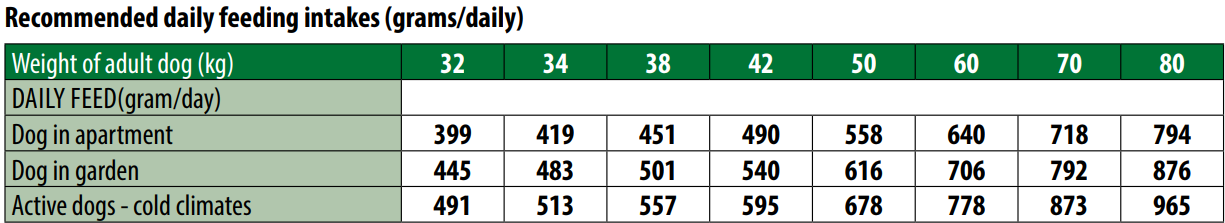 חלבון גולמי 27%, סיבים 2.5%, שומן 12.5%, אפר 6.2%, סידן 1.5%, פוספור 1.1%, חומצות שומן אומגה-3 0.5%, אומגה-6 3.5%, אנרגיה מטבולית 4000 קק"ל/ק"ג.