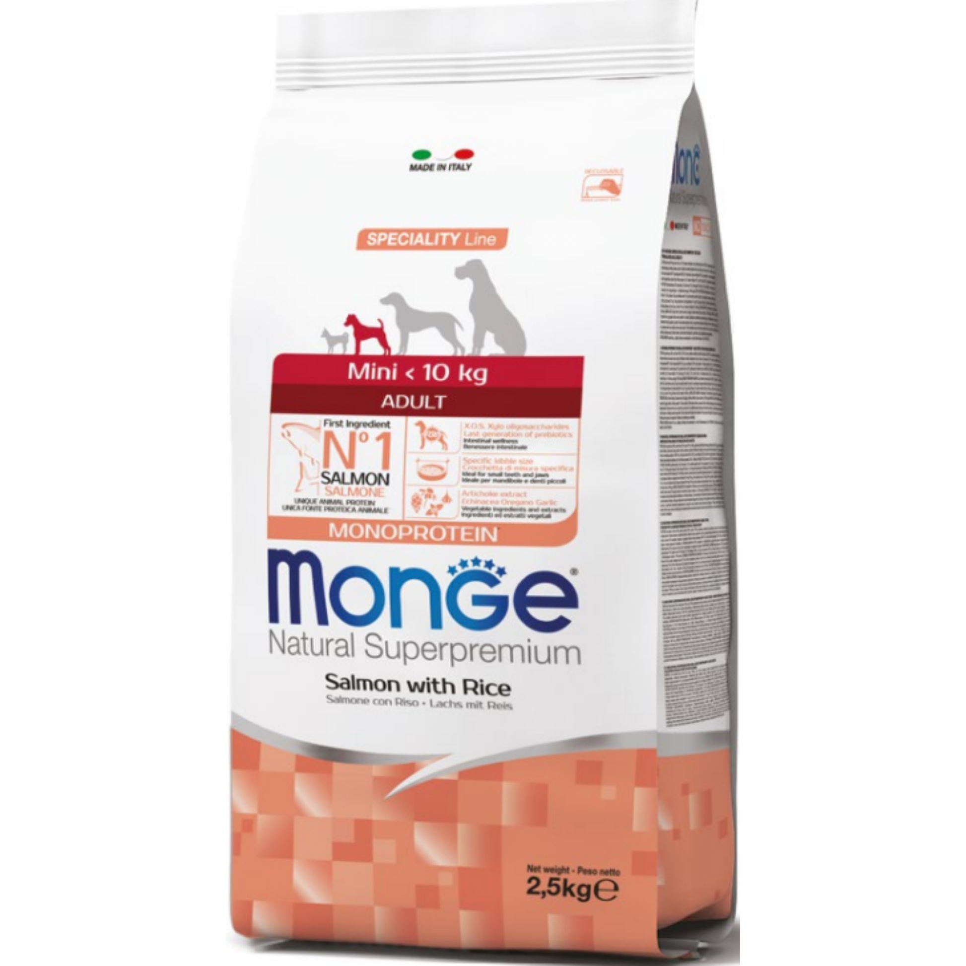 מזון מלא לכלבים קטנים מבוגרים, מבוסס על סלמון כחלבון יחיד ואורז. עשיר בדגים טריים, פרה־ביוטיקה XOS, תוספי צמחים ונוגדי חמצון. ללא צבעי מאכל וחומרים משמרים.
