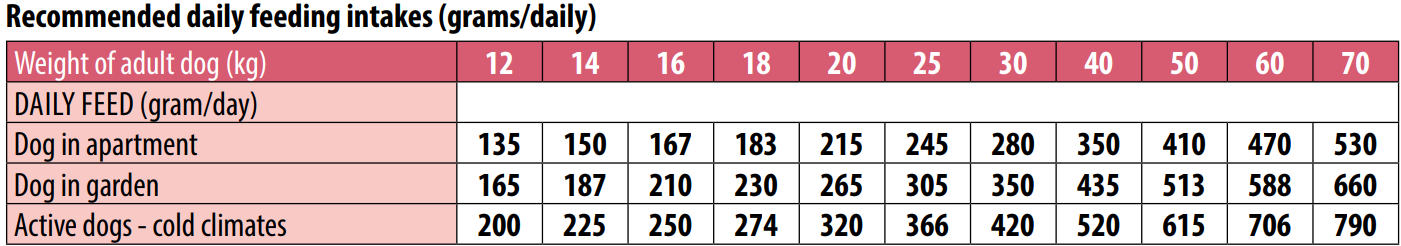 בקר (מיובש 30%, בשר טרי 10%), אורז (7%), שומן מהחי (שומן טל-מטוהר 99.5%), חלבון תפוחי אדמה, תירס, סלק מיובש, חלבונים מהחי הידרוליזטיים (כבד), שמרי בירה מושבתים, שיבולת שועל, מינרלים, מוצרי שמרים (מנאן-אוליגוסכרידים MOS 1%), קסילו-אוליגוסכריד (XOS 0.3%), יוקה שידיגרה (0.3%), ארוחה מאצות (ספירולינה – Arthrospira platensis 0.3%), מוצרים מתהליכי עיבוד צמחים (שורש אכינצאה סגולה 0.2%, אורגנו 0.1%), שום מיובש (0.2%), גלוקוזאמין, כונדרויטין סולפט.