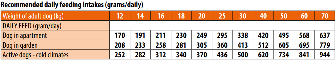 חלבון גולמי: 25%, סיב גולמי: 2.5%, שומן גולמי: 16%, אפר גולמי: 7%, סידן: 1.7%, זרחן: 1.1%, חומצות שומן אומגה-3: 0.5%, חומצות שומן אומגה-6: 3.5%, אנרגיה מטבולית: 4,100 קק"ל/ק"ג.