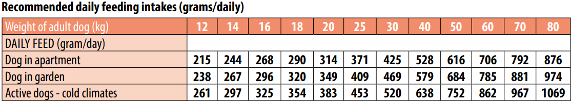 חלבון גולמי 25%, סיב גולמי 2.5%, שומן גולמי 14%, אפר גולמי 6.5%, סידן 1.2%, זרחן 0.9%, חומצות שומן אומגה-3 0.9% וחומצות שומן אומגה-6 4%, עם ערך אנרגיה מטבולית של 4,020 קק"ל לק"ג.