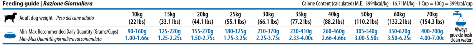 חלבון גולמי 30%, שומן גולמי 18%, סיבים 2.9%, לחות 9%, אפר 6.9%, סידן 0.8%, פוספור 0.7%, אומגה-6 1.6%, אומגה-3 2.3%, DHA 1%, EPA 0.7%, גלוקוזאמין 1200 מ"ג/ק"ג, כונדרויטין 900 מ"ג/ק"ג.
