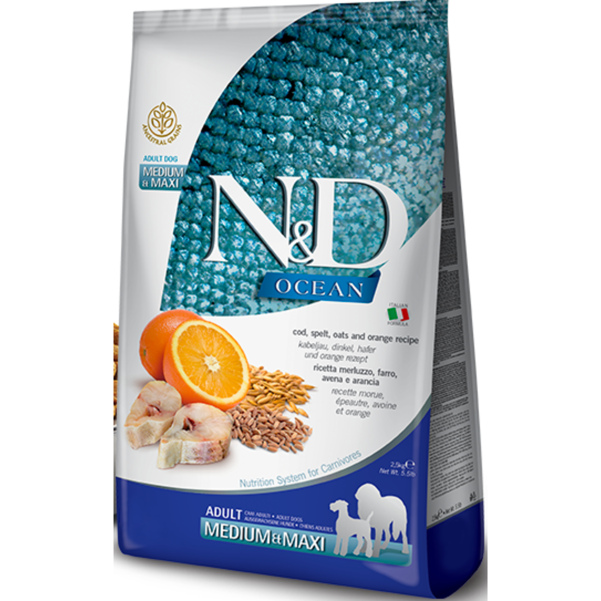 מזון לכלבים מבוגרים, מתאים לכלבים מגזע בינוני וגדול Medium & Maxi המכיל מרכיבים נבחרים כמו דג קוד ותפוז,תומך בבריאות ובמערכת התזונה של הכלב.