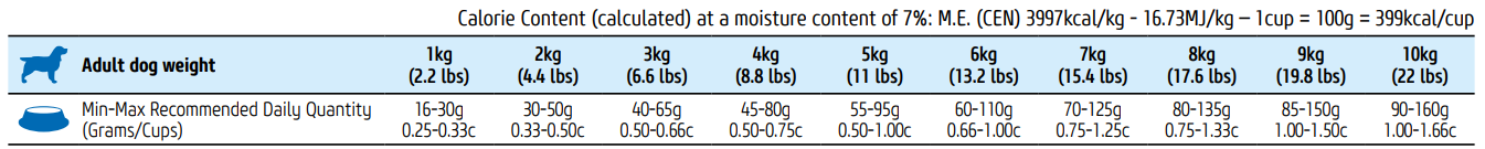 חלבון גולמי לפחות 30%, שומן גולמי לפחות 18%, סיבים גולמיים עד 2.9%, לחות עד 9%, אפר עד 6.8%, DHA לפחות 0.5%, EPA לפחות 0.3%, סידן לפחות 0.9%, זרחן לפחות 0.8%, אומגה-6 לפחות 3.3%, אומגה-3 לפחות 0.9%, גלוקוזאמין לפחות 1,000 מ״ג/ק״ג וכונדרויטין סולפט לפחות 700 מ״ג/ק״ג.