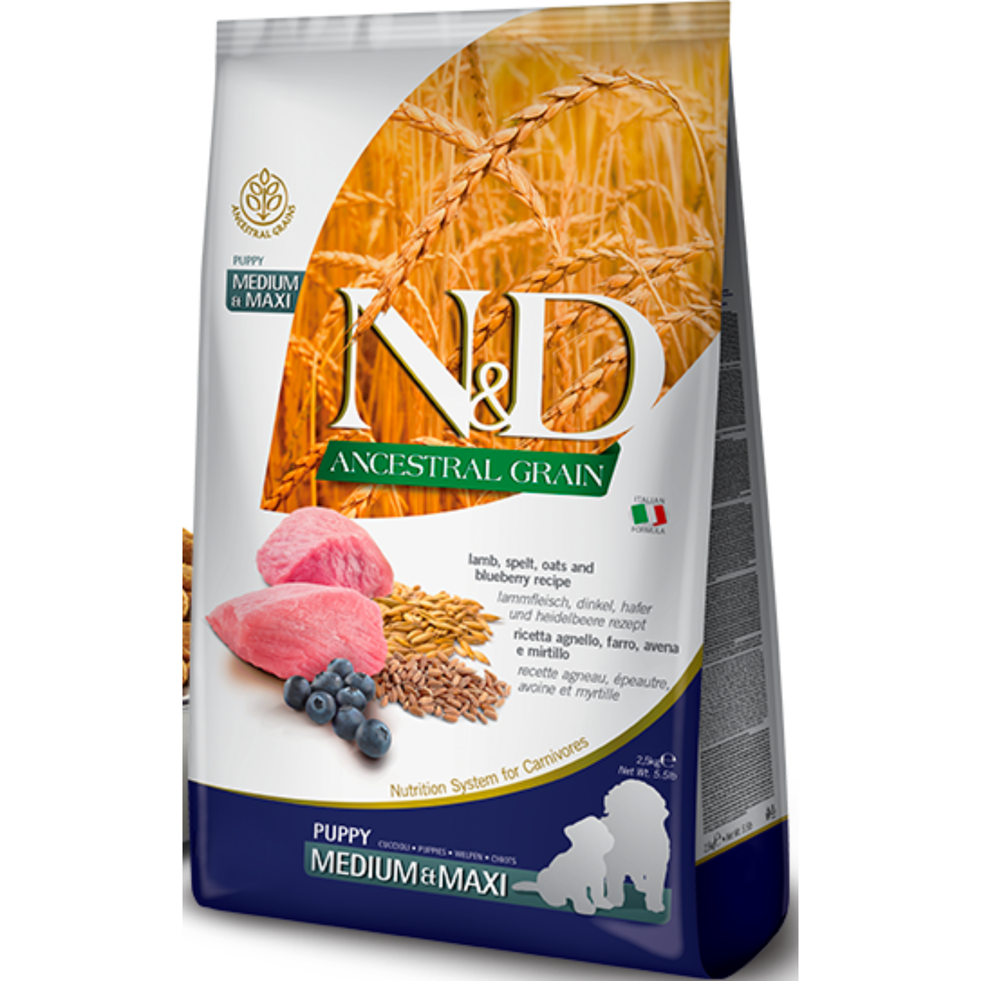 מזון N&D עם טלה, כוסמין, שיבולת שועל ואוכמניות לכל שלבי החיים, ללא GMO , עשיר בחלבון מן החי ובעל אינדקס גליקמי נמוך ורכיבים איכותיים.